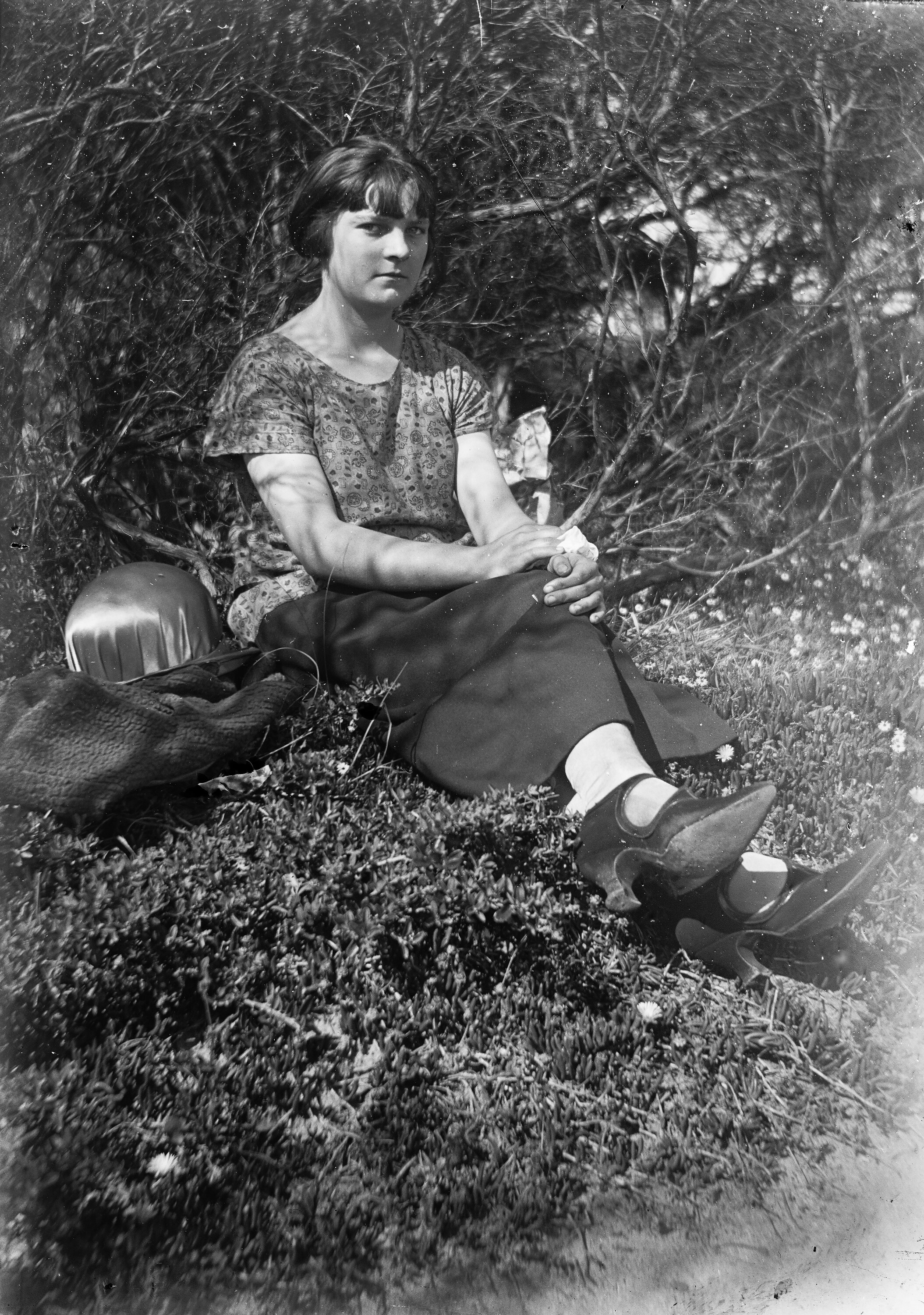 Black and white 1/6th plate glass negative of a woman seated on slightly sloped ground beneath tree branches. Her hat is on the ground next to her.