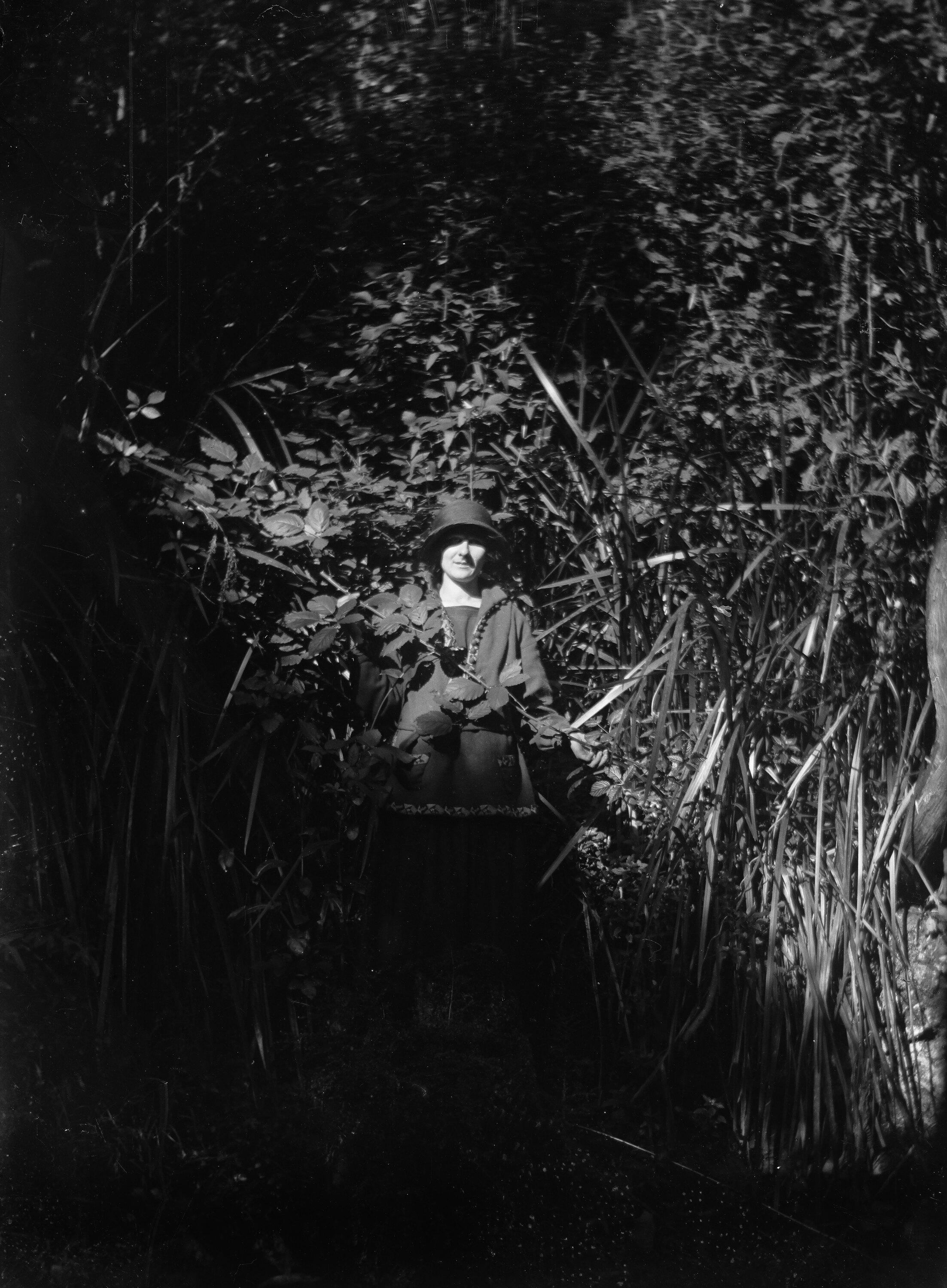 Black and white 1/6th plate glass negative of a woman in a heavily vegetated forest or garden.