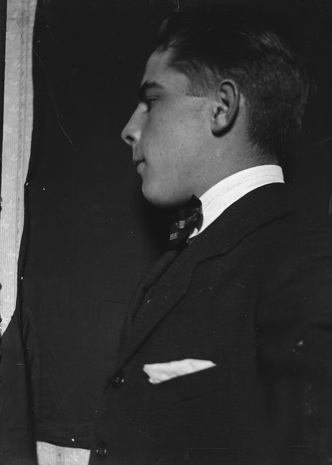 Black and white 1/6th plate glass negative of the profile of a young man in suit and bowtie.
