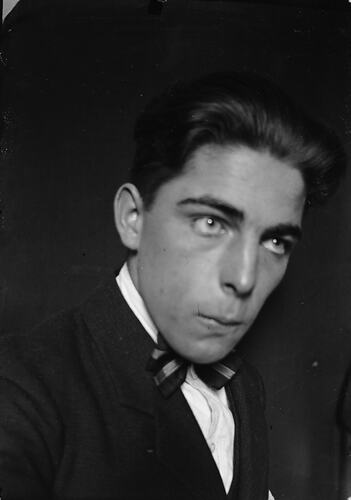 Black and white 1/6th plate glass negative of a young man in suit and bowtie.