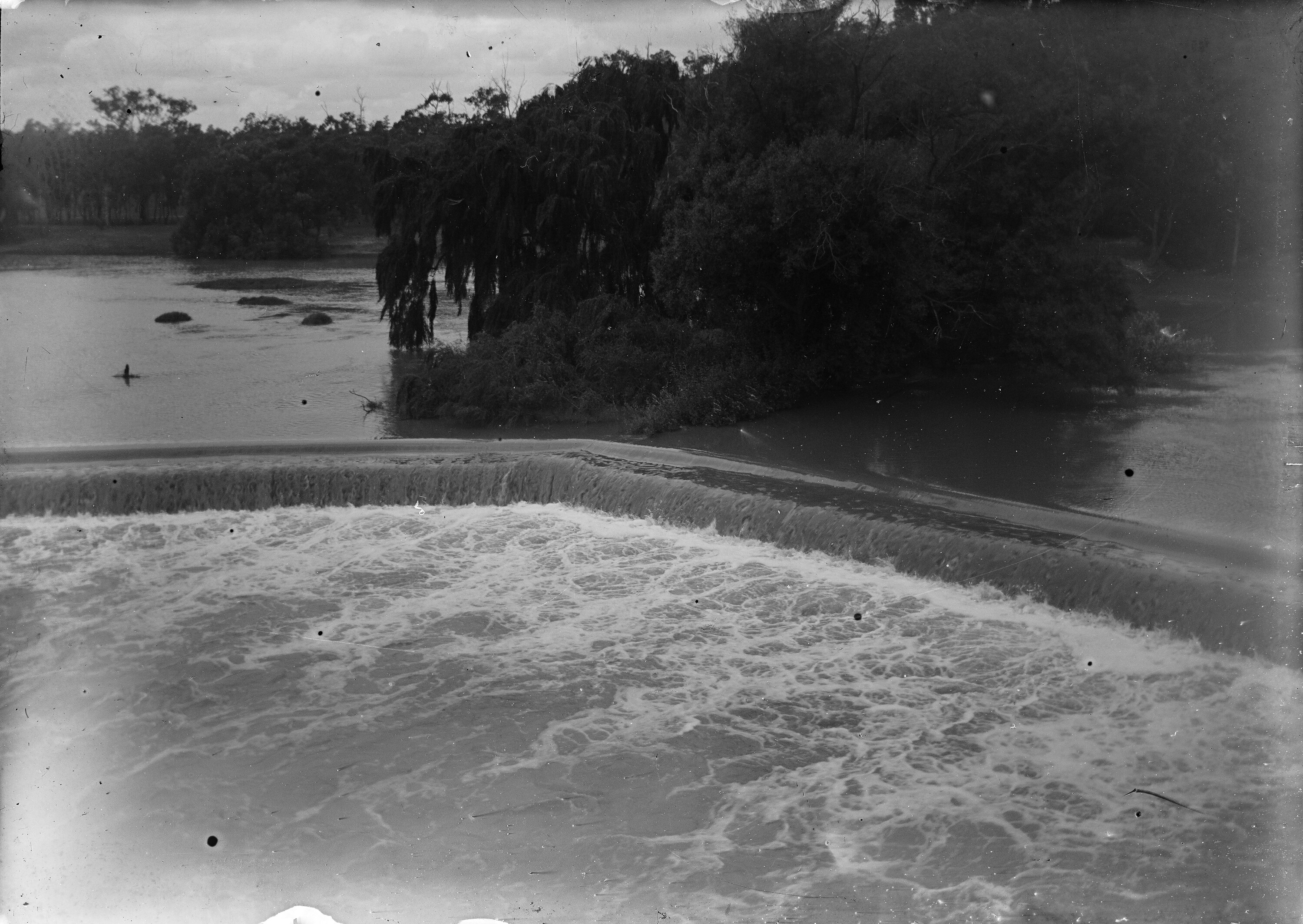 Black and white 1/6th plate glass negative of a lake, with weir and various trees around the bank, including willows.