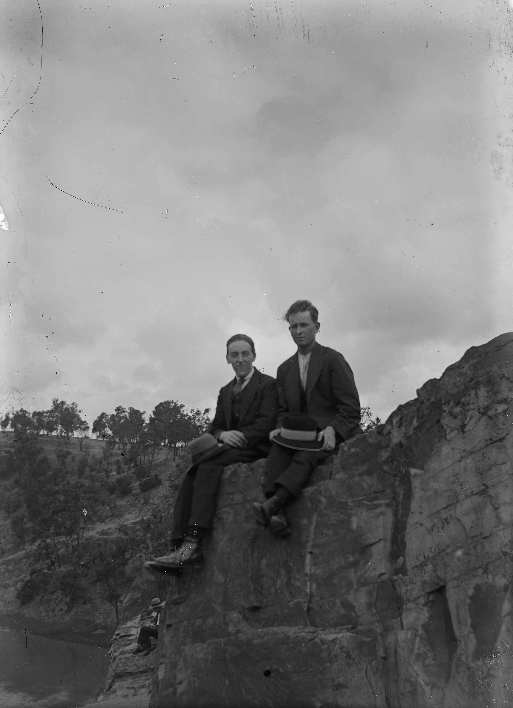 Black and white 1/6th plate glass negative of two men seated on a cliff, overlooking a lake or dam.