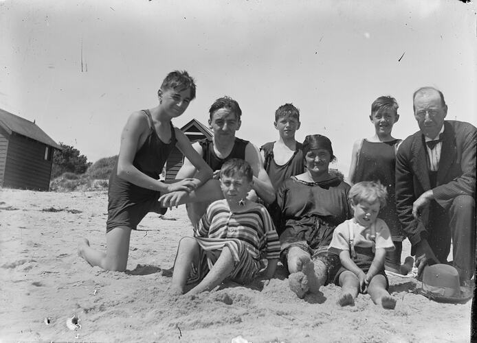 Family group of men, women and children seared on the beach, with beach huts visible in the distant background.