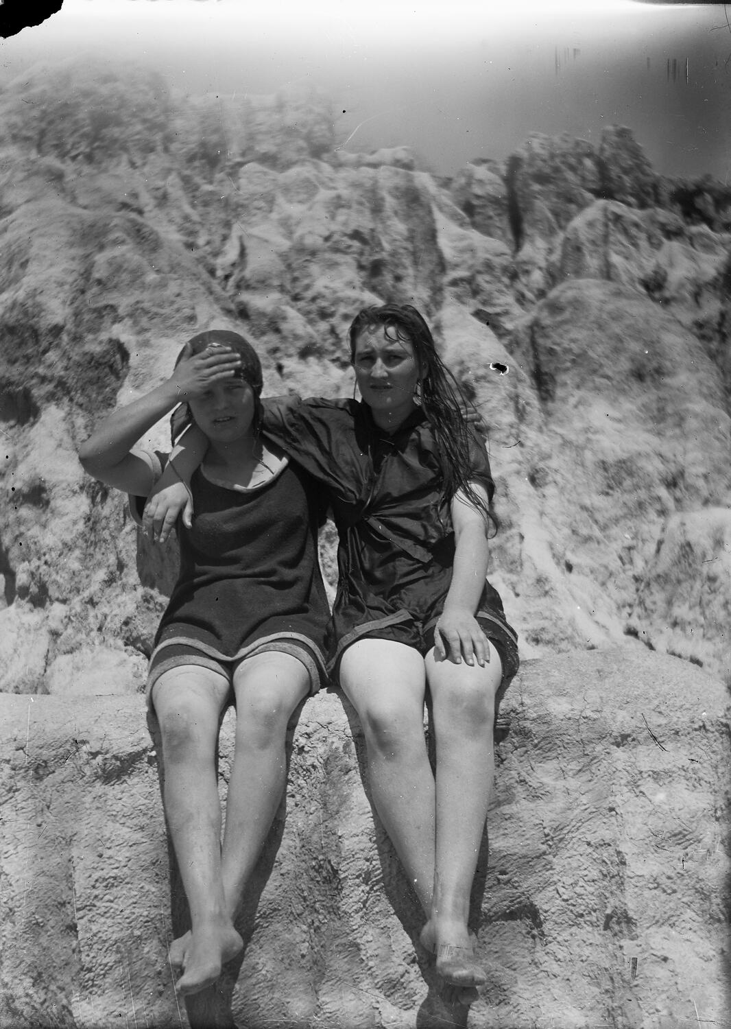 Black and white 1/6th plate glass negative of a two young women seated together on a sea wall or bathing pool wall, in their swimming/bathing costumes.