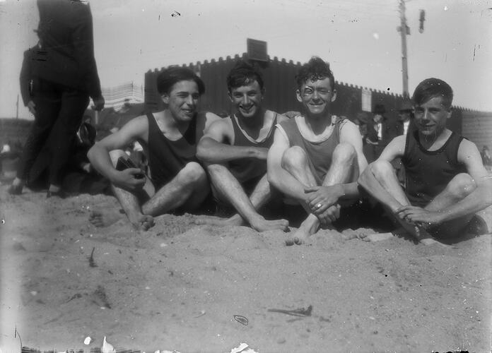Black and white 1/6th plate glass negative of a group of four young men seated on the beach in their bathing costumes, with pedestrians in suits and a tall building visible behind them.
