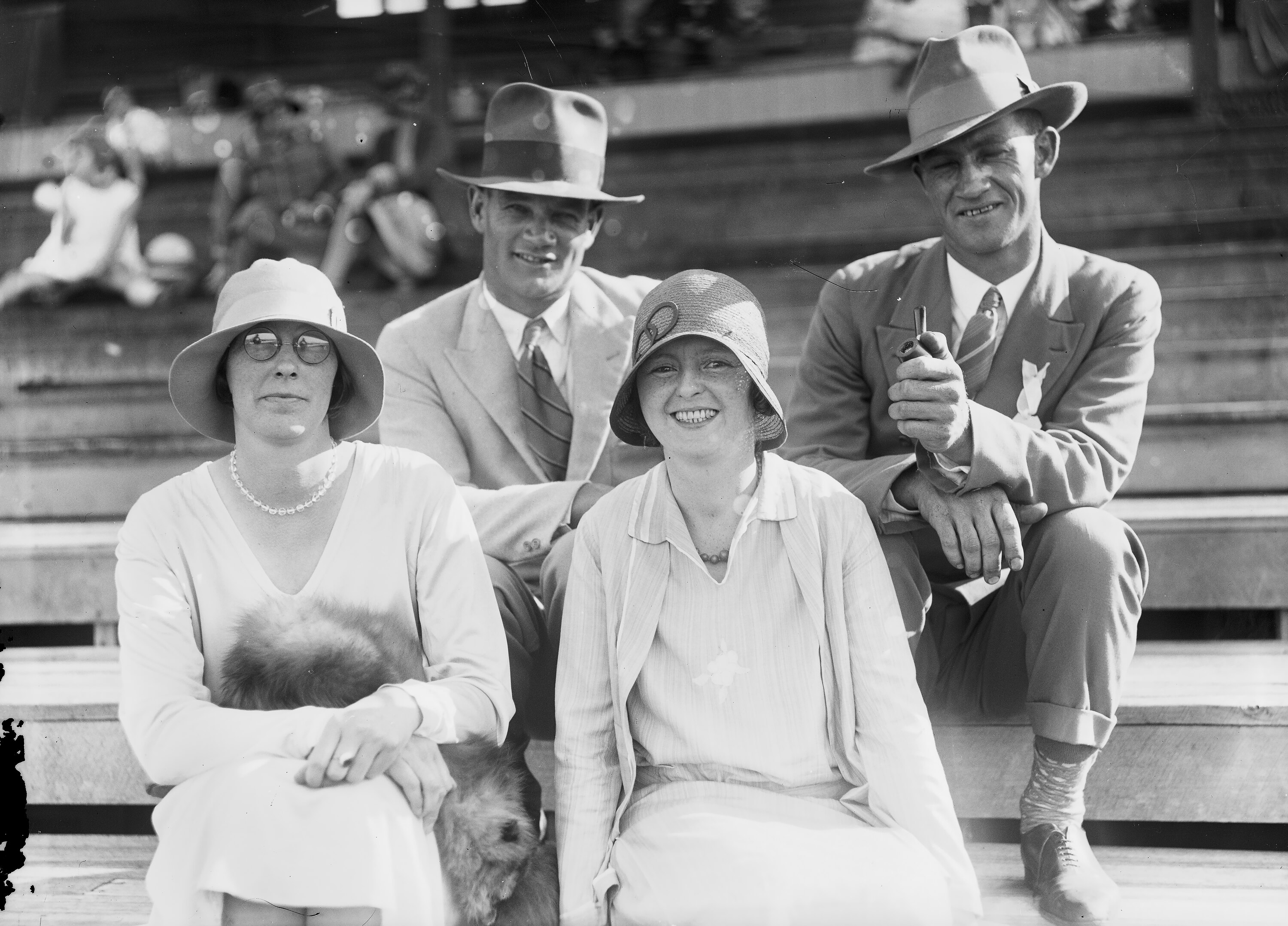 Group of two men and two women seated in a sports stand. Men in suits and hats, women in hats and loose dresses. Man on the right has a lapel pin/ medal and holds a smoking pipe.