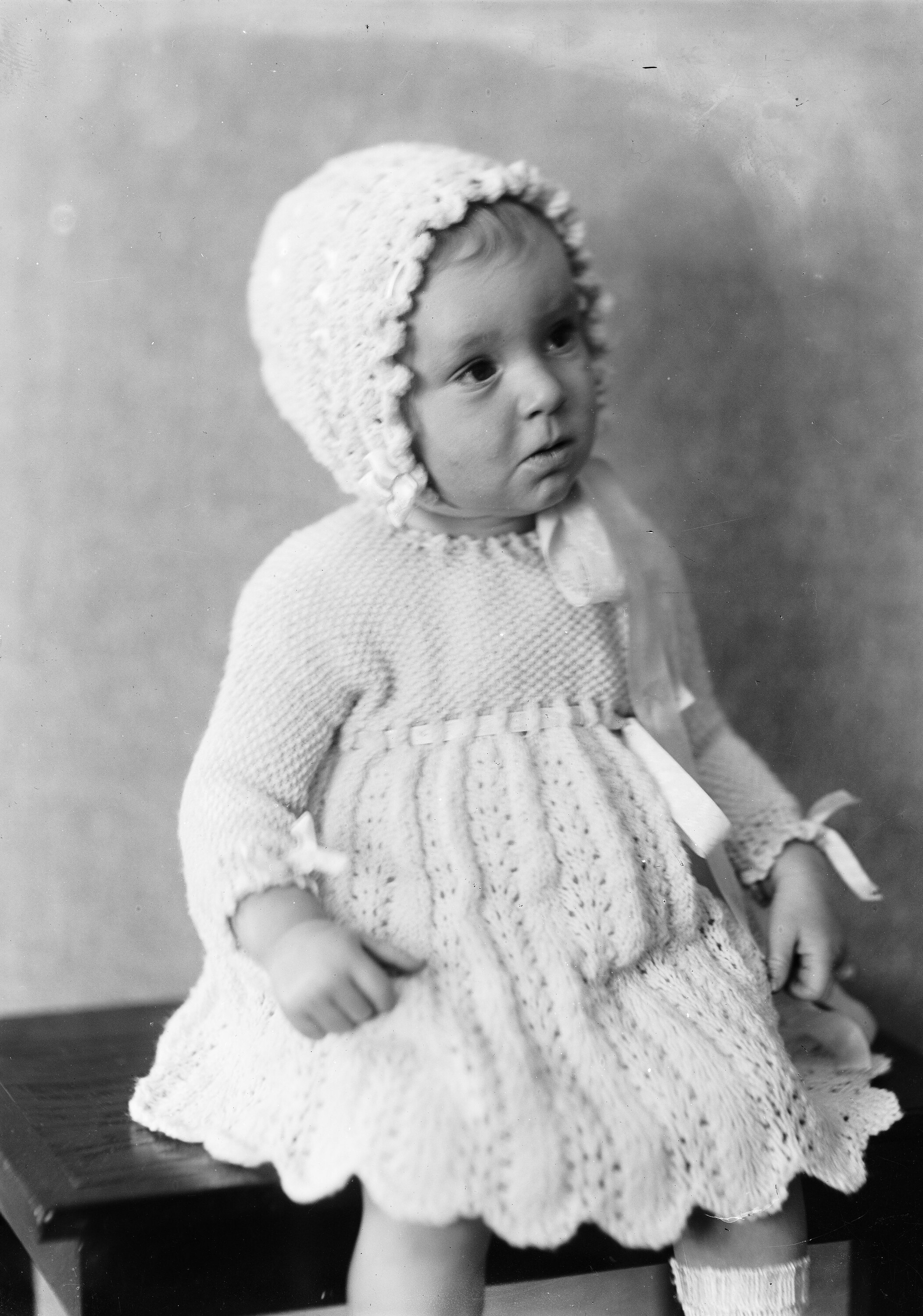 Toddler in woollen dress and bonnet, seated on a low stool.