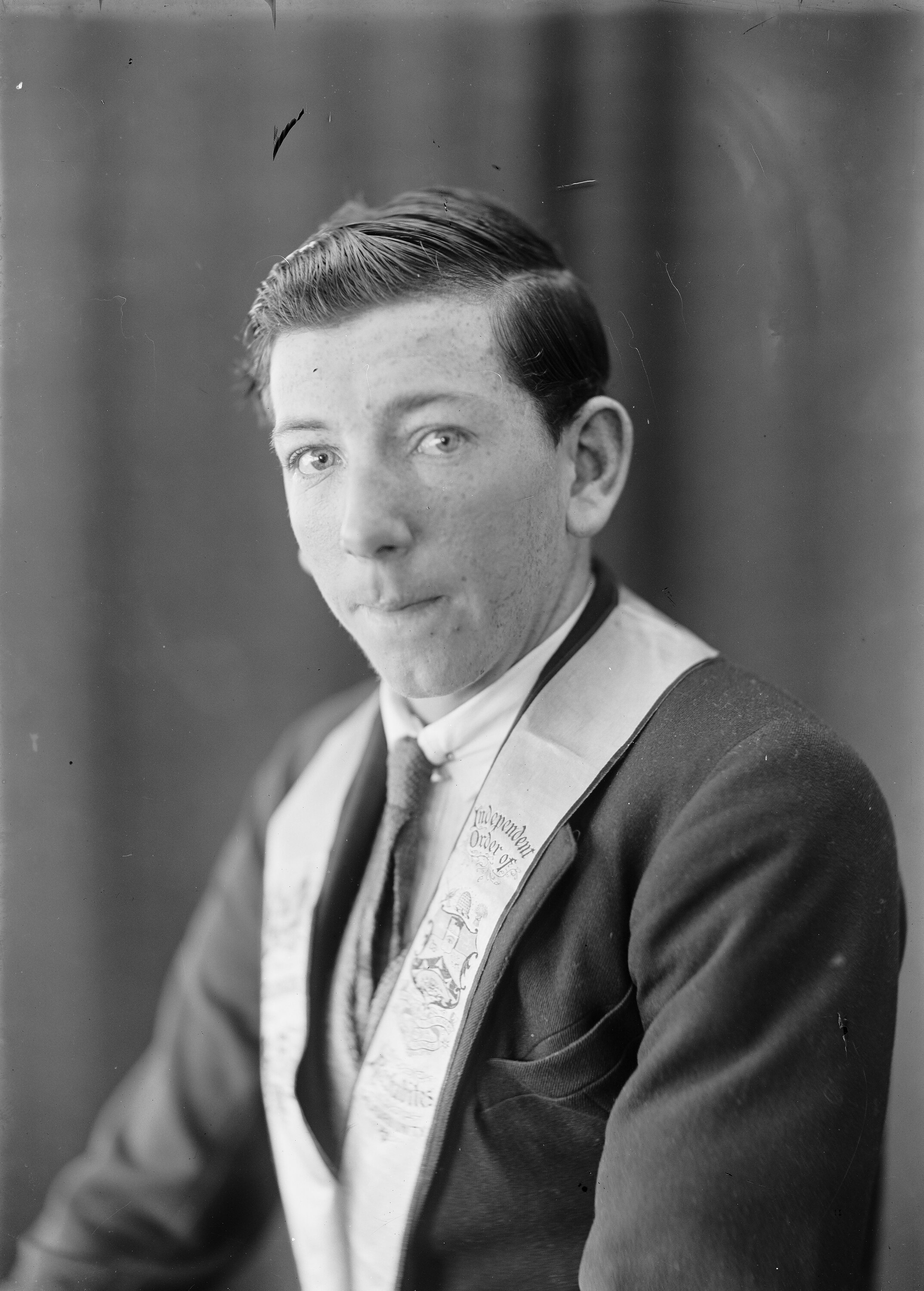 Studio portrait of a young man in an Independent Order of Rechabites ceremonial collar.