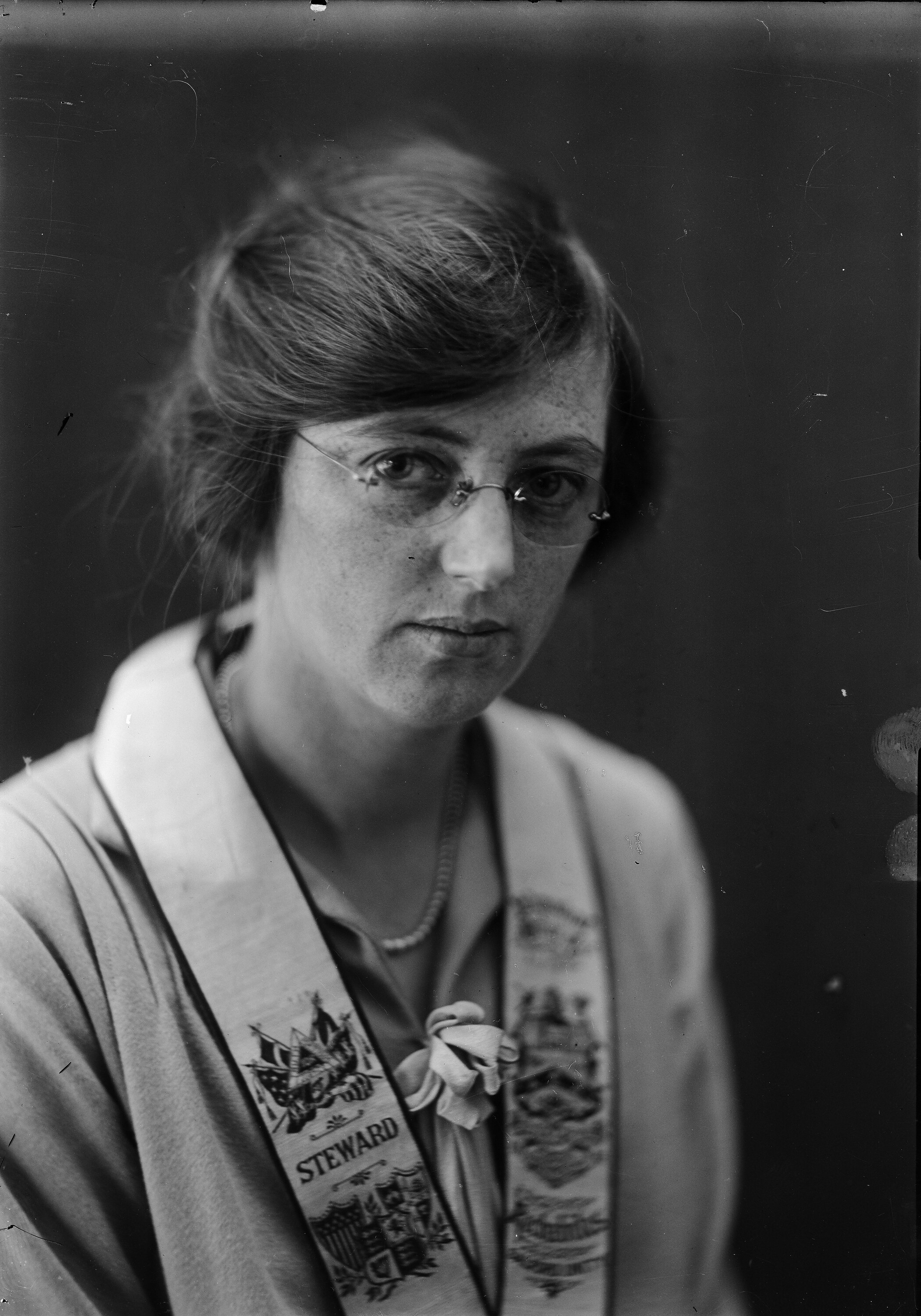 Black and white, half plate negative featuring a studio portrait of a woman in glasses with a ceremonial collar from the Independent Order of Rechabites, circa 1930s. The collar identifies her as a Steward.