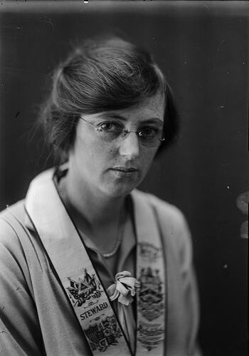 Studio portrait of a woman in glasses, her hair swept up to the side. She is wearing an Independent Order of Rechabites ceremonial collar with 'Steward' embroidered between various crests on the collar/sash.