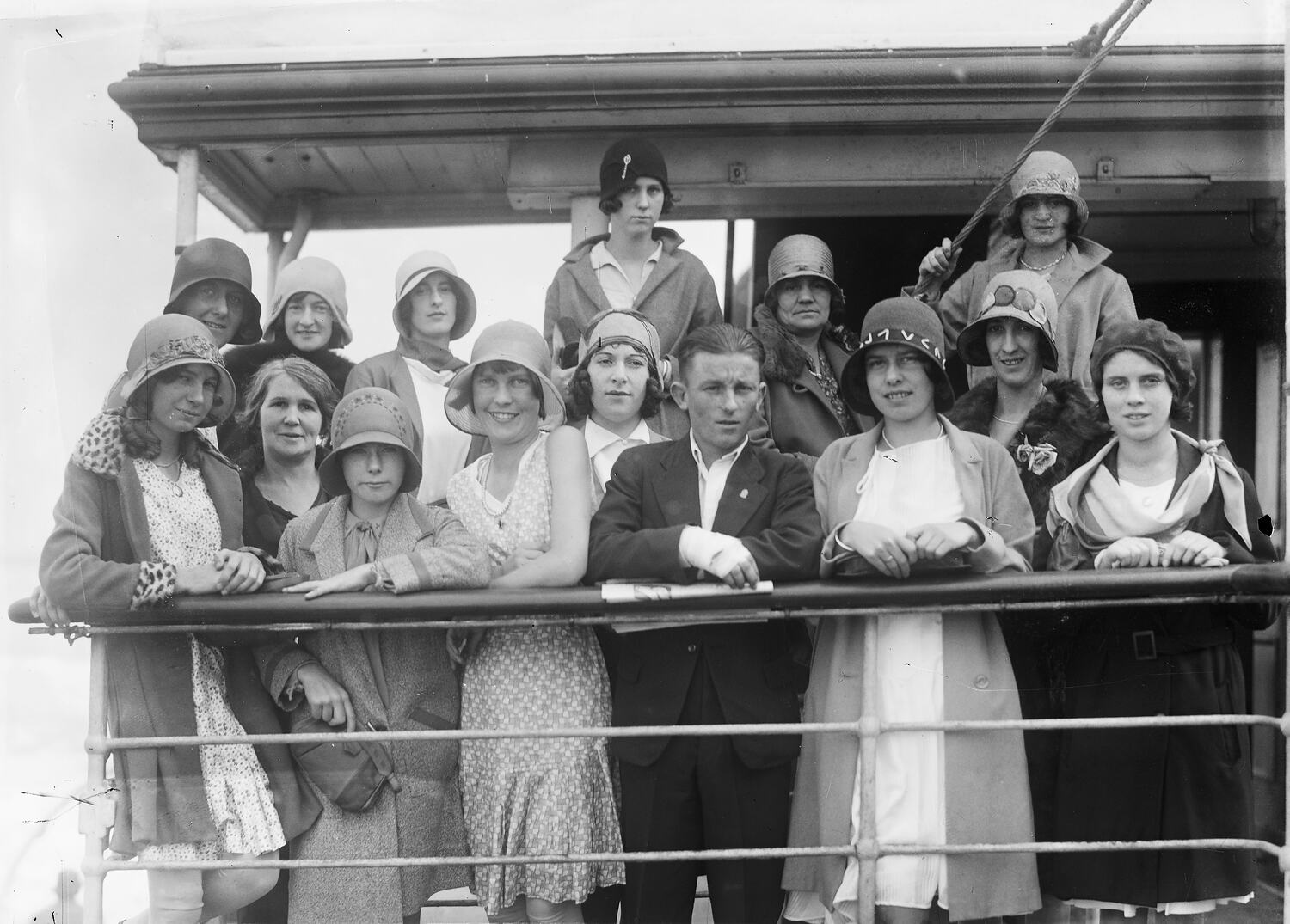 Black and white, half plate negative featuring a group of men and mostly women standing on a balcony. These are possibly members of the Independent Order of Rechabites, as there are other photos in this group featuring Rechabite members and one man wears a small lapel pin similar to those seen in other Rechabite photographs.