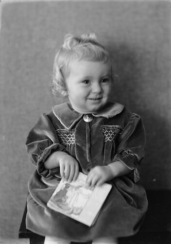Black and white, half plate negative featuring a studio portrait of a toddler in a smock seated on a low bench, holding a book. It is likely the child of members of the Independent Order of Rechabites, as there are other photos in this group featuring Rechabite members, taken circa 1930s.
