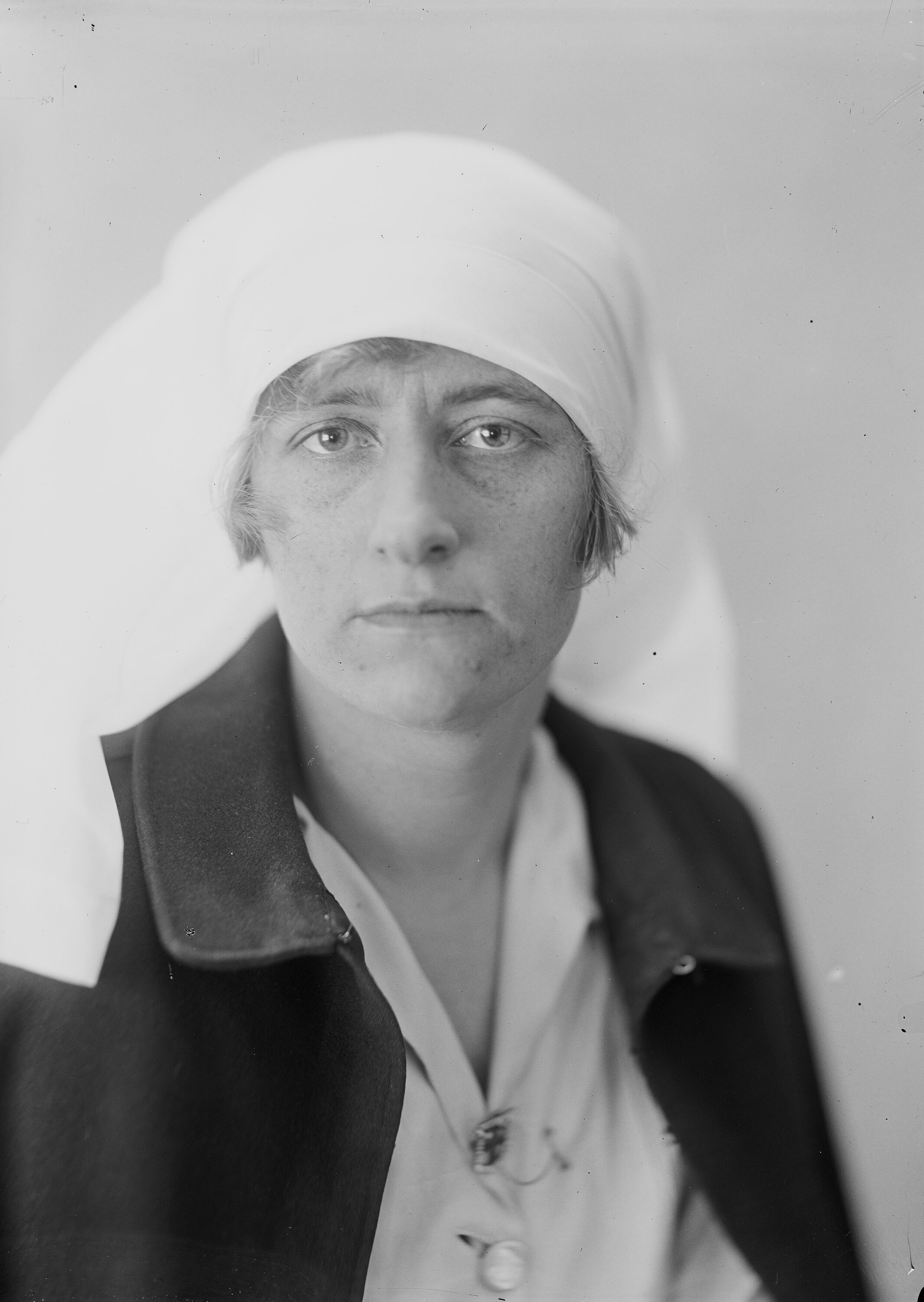 Black and white, half plate negative featuring a studio portrait of a nun in habit, circa 1930s. She may have some relation to the Independent Order of Rechabites. This woman could also possibly be a nurse.