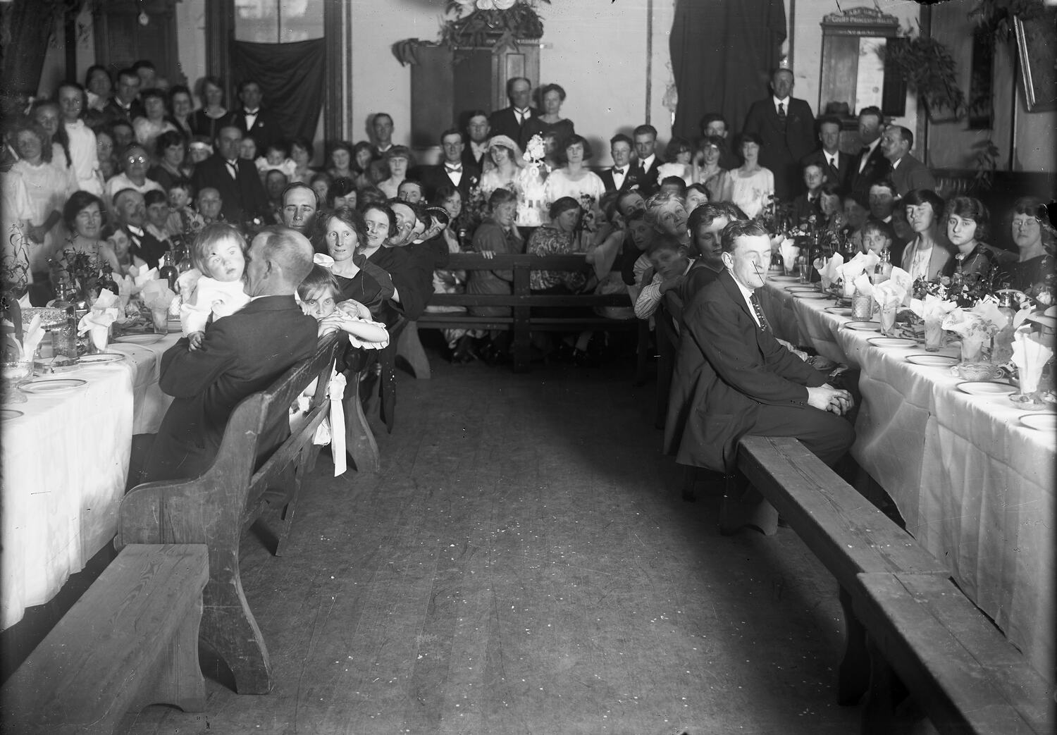 Black and white, half plate negative featuring a wedding dinner circa 1910s. These are possibly members of the Independent Order of Rechabites, as there are other photos in this group featuring Rechabite members.