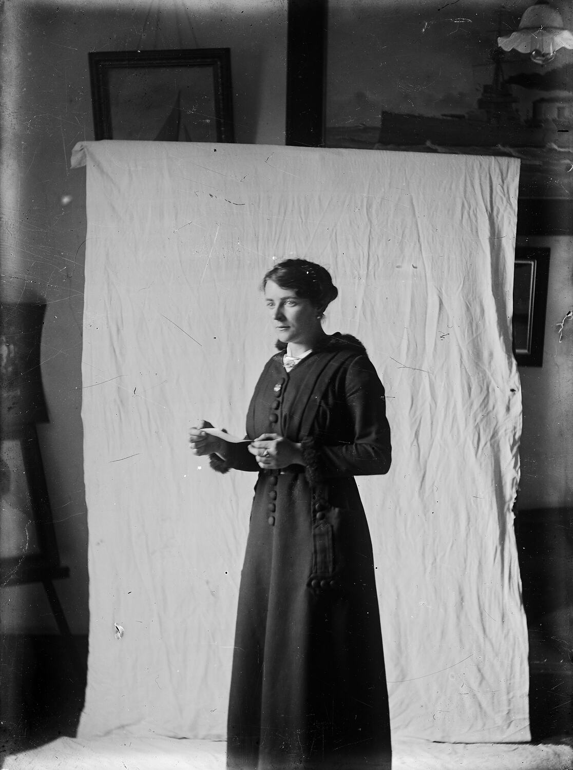 Black and white, half plate negative featuring a woman standing against a cloth backdrop arranged in a room with framed photographs and paintings on the wall behind, This was likely taken circa 1910s. This woman is possibly a member of the Independent Order of Rechabites, as there are other photos in this group featuring Rechabite members.