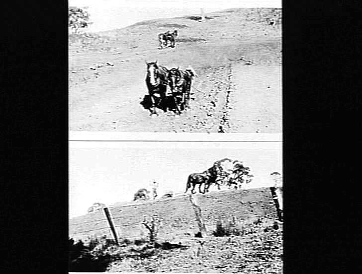 Photograph of the construction of a farm dam using horse drawn timble scoops on Mr. F. C. Williames property, Hill End (Gippsland), Victoria, about 1930. The scoop in the foreground is being worked by Mr. Williames.