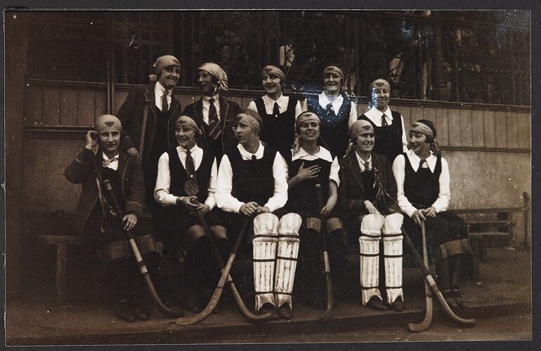 Group of young student women in hocky gear.
