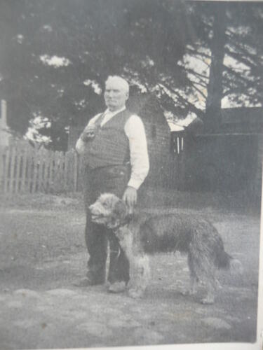 Digital copy of original photograph of John Lawrey with his dog, Kinglake, circa 1930.