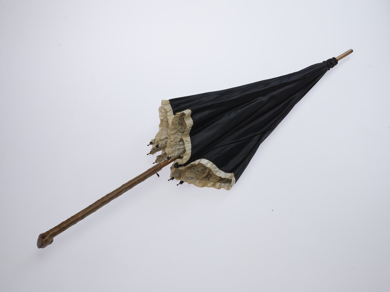Parasol with black silk outer canopy edged in lace. The canopy interior is lined with multiple tiers of scalloped cream machine-made lace. The handle is made from a bamboo with a highly polished patina. The handle has been broken in the centre, and at the time of acquisition is in two pieces.