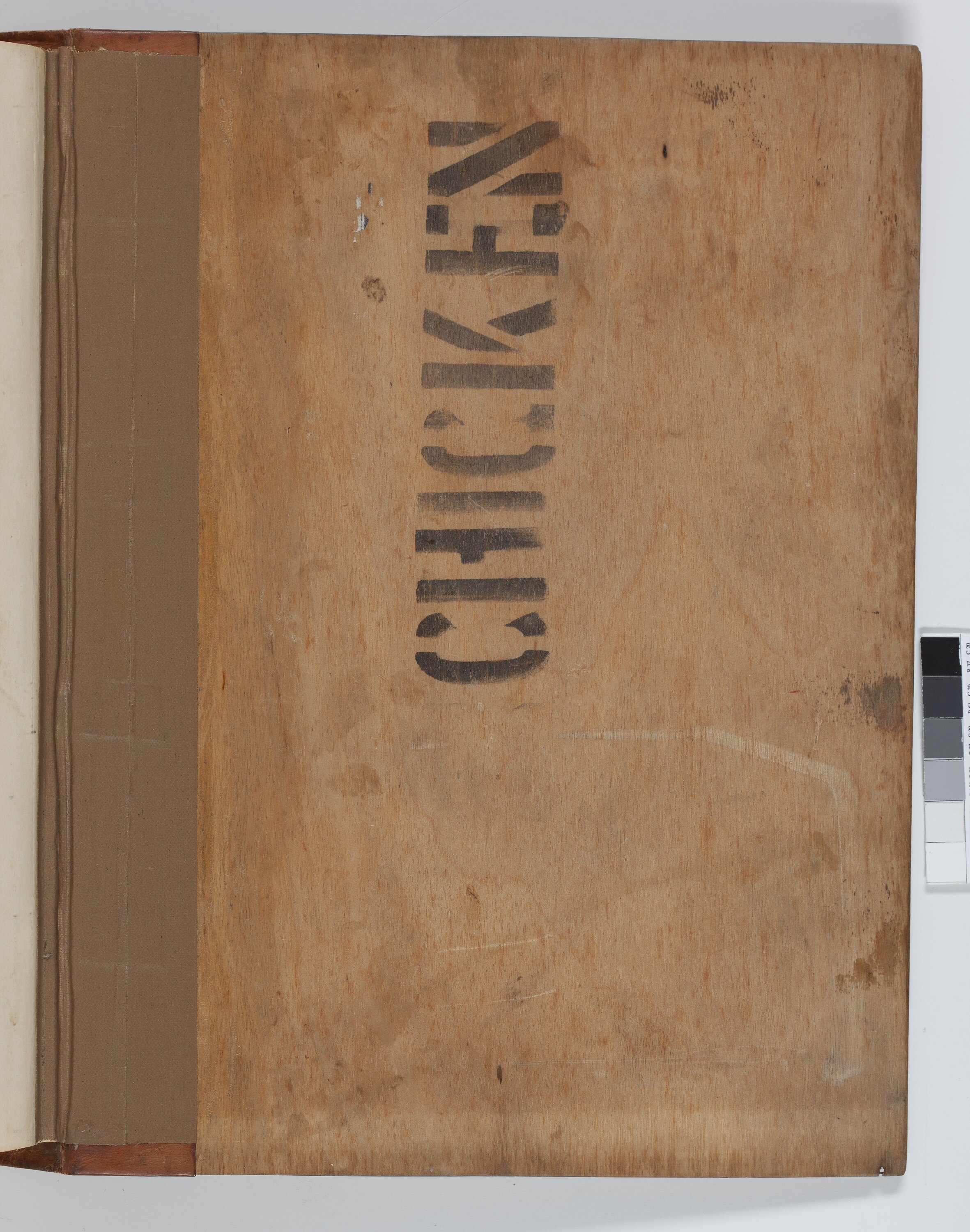 The covers were made from venesta packing cases used to store supplies by motor mechanic Bernard Day. The contents of each case was stencilled on the outside, and these stencils are often used to identify different copies of 'Aurora Australis'. Museums Victoria's copy is known as the 'Chicken Copy'.
