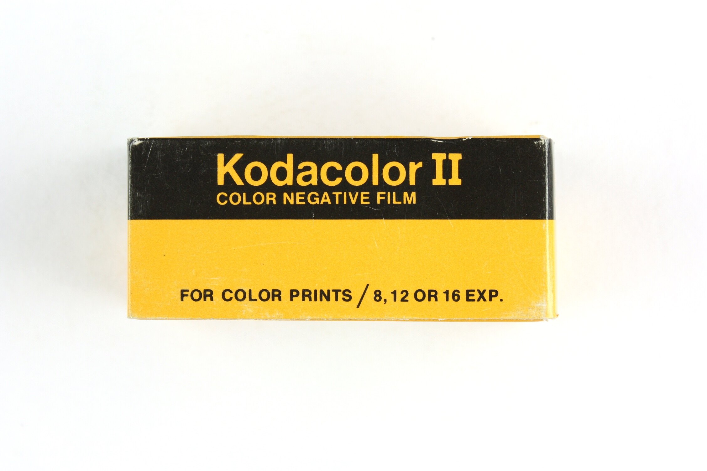 Front, printed: ' Kodacolor II / COLOR NEGATIVE FILM / FOR COLOR PRINTS/8, 12 OR 16 EXP.' Side, printed: 'Kodacolor II / FILM FOR COLOR PRINTS / 8, 12 OR 16 EXP. / C 127'