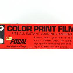 Box, front, printed: '[Graphic illustration of a film cartridge] FITS ALL INSTANT / LOADING CAMERAS [graphic illustration of a photo album] [Kmart logo] STORE / KEY 3 / 1.29 / COLOR PRINT FILM / Satisfaction Always 126 CARTRIDGE/12 EXPOSURE / [Kmart logo] FOCAL / Packaged in Australia for K mart (Australia) Limited'