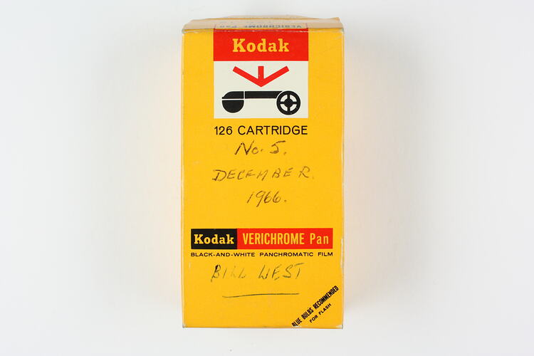 Box, front, printed: 'Kodak / [graphic of a red arrow pointing down] / [graphic illustration of a 126 film cartridge] / 126 CARTRIDGE / Kodak VERICHROME Pan / BLACK-AND-WHITE PANCHROMATIC FILM / BLUE BULBS RECOMMENDED / FOR FLASH' Box, front, handwritten, blue ink: 'No.5. / DECEMBER / 1966 / BILL WEST'