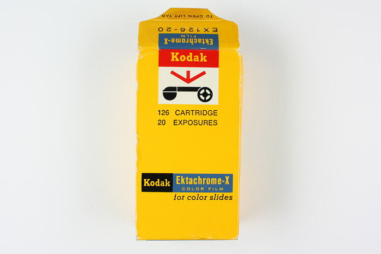 Box, front, printed: 'Kodak / [graphic of a red arrow pointing down] / [graphic illustration of a 126 film cartridge] / 126 CARTRIDGE / 20 EXPOSURES / Kodak EKTACHROME-X / COLOR FILM / for color slides'
