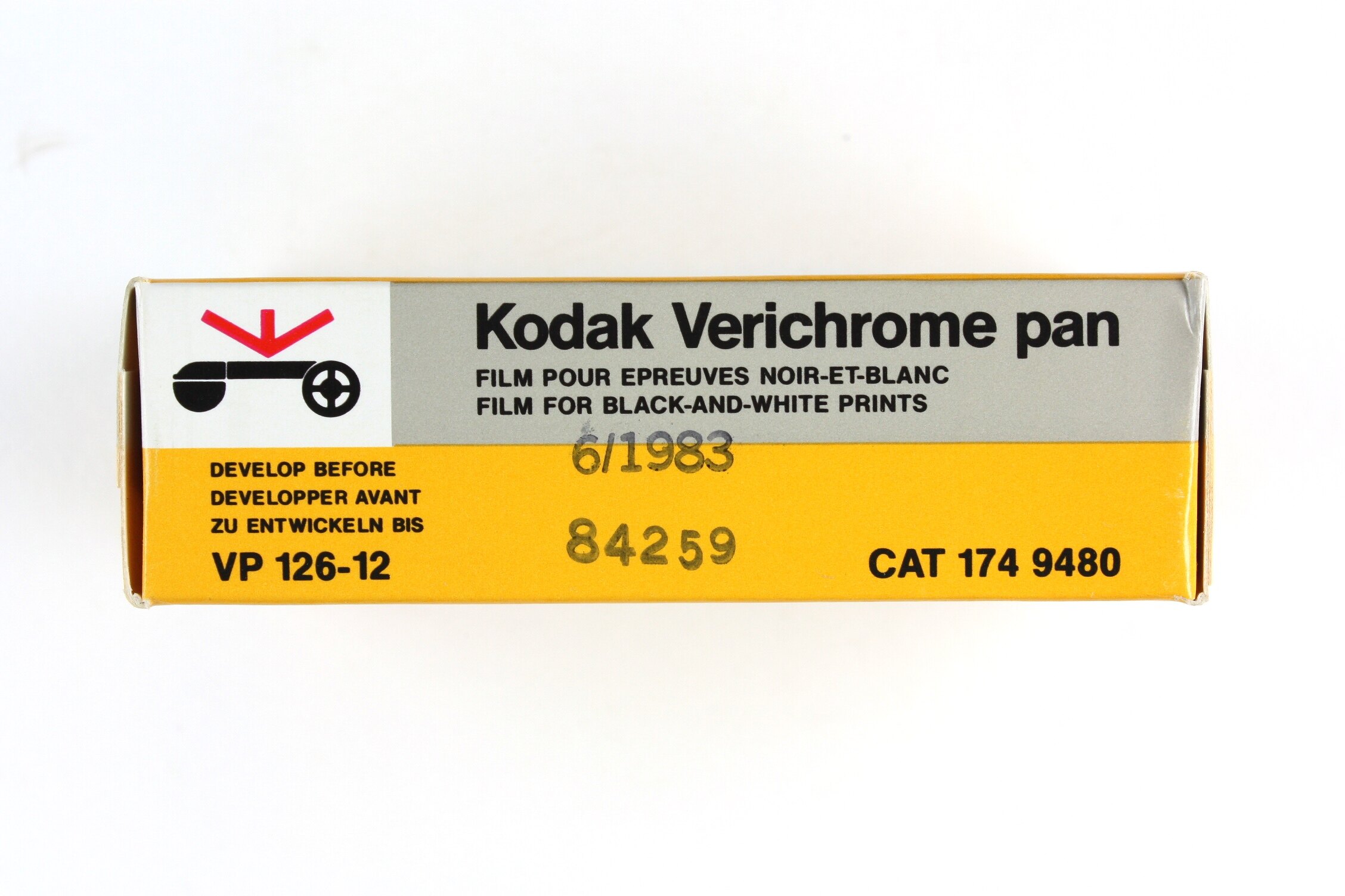 Verichrome Pan 126 film cartridge in original box, 12 black and white exposures, manufactured by Eastman Kodak Company, USA, to be developed before June 1983. Product code VP 126-12.