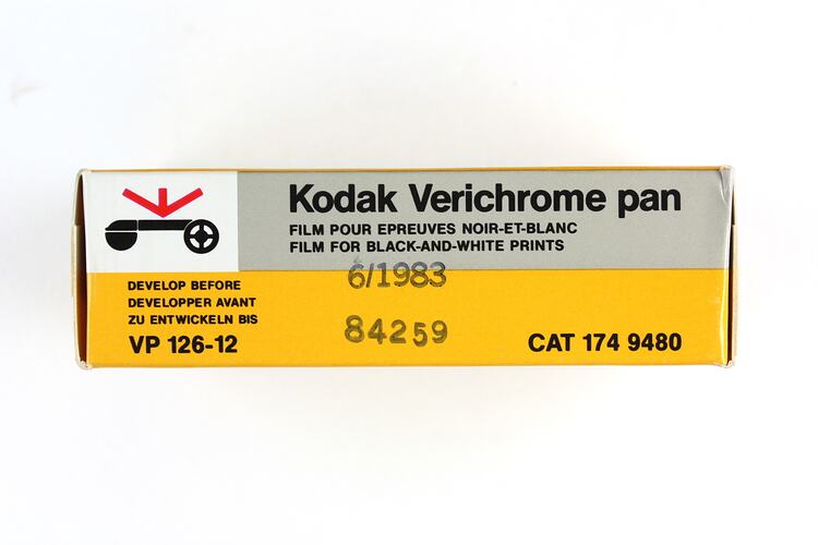 Box, front, printed: '[graphic of a red arrow pointing down] / [graphic illustration of a 126 film cartridge] / Kodak VERICHROME Pan / FILM FOR BLACK-AND-WHITE PRINTS / FILM FUR SCHWARZWEISS-BILDER'