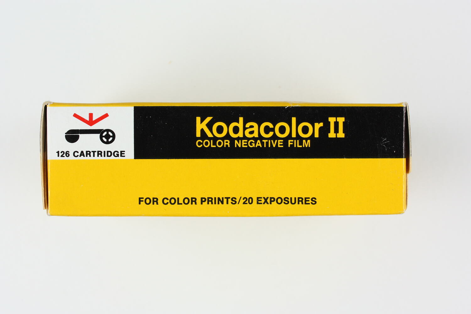 Front, printed: 'Kodak / [graphic of a red arrow pointing down] / [graphic illustration of a 126 film cartridge] / 126 CARTRIDGE / Kodacolor II . COLOR NEGATIVE FILM / FOR COLOR PRINTS/20 EXPOSURES'