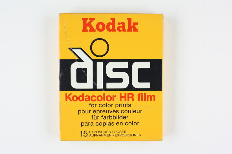 Box front, printed: 'Kodak / disc / Kodacolor HR film / for color prints / [...] 15 EXPOSURES . POSES / [...]'