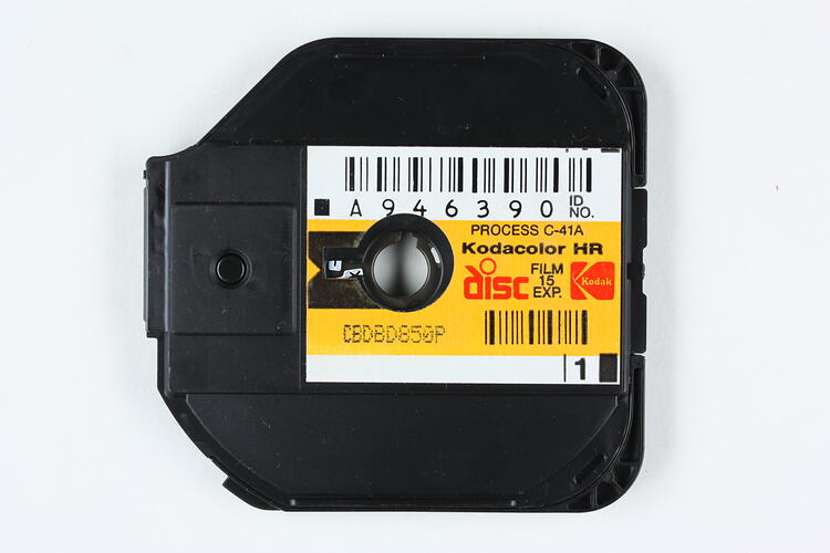 Label, printed: '[barcode] / PROCESS C-41A / Kodacolor HR / disc FILM / 15 / EXP. [Kodak 'K' logo] / [barcode]'