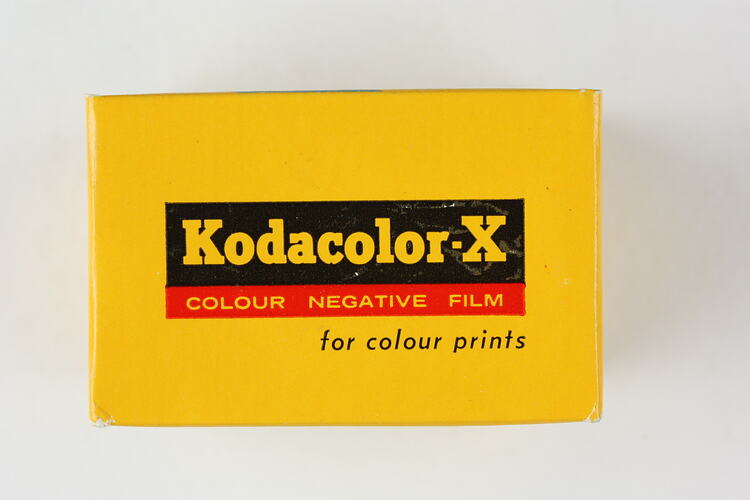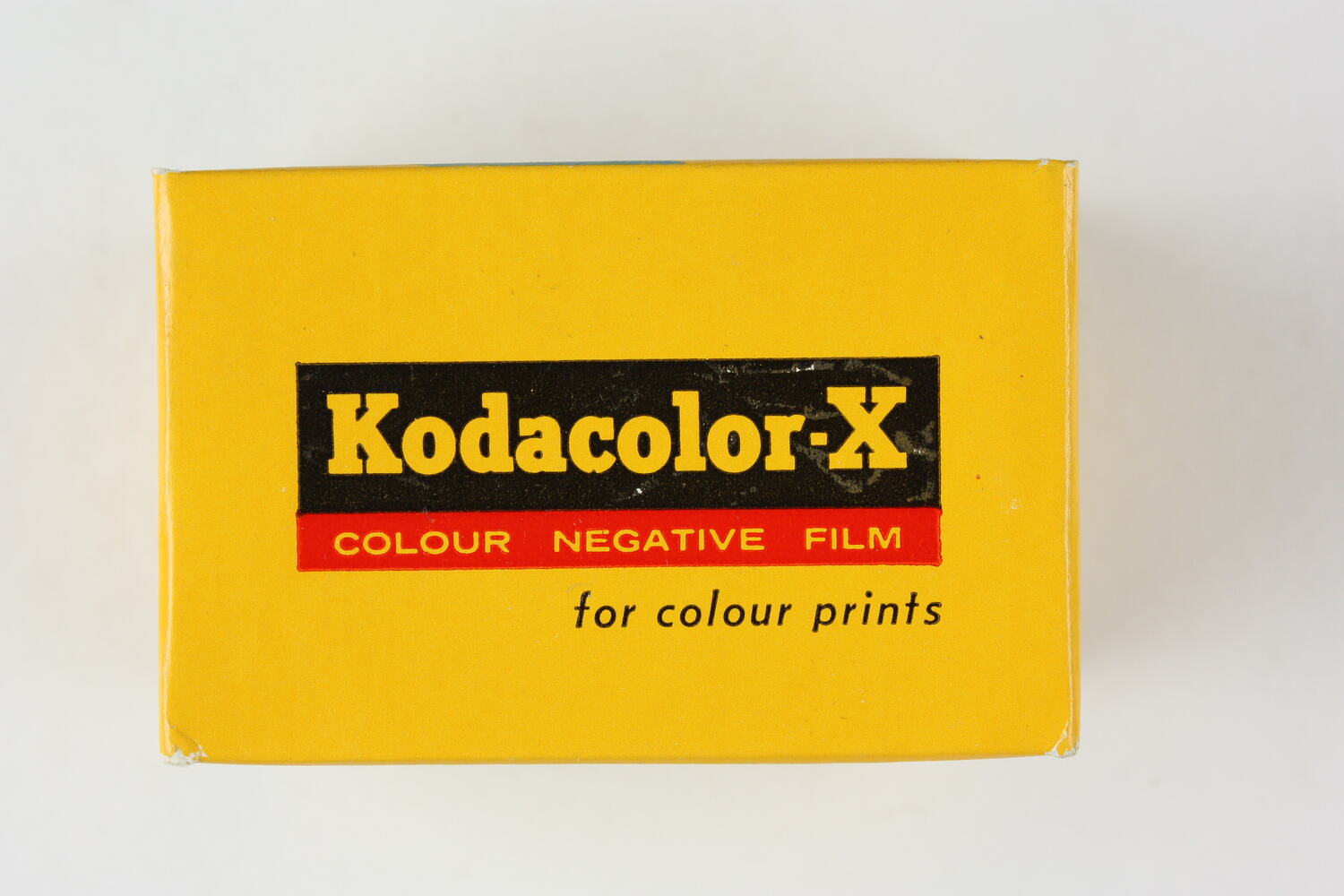 Front, printed: 'Kodacolor-X / COLOUR NEGATIVE FILM / for colour prints' Side, printed: 'Kodacolor-X / FILM / for colour prints / DAYLIGHT OR / BLUE FLASH / CX135-12' Top, printed: 'Kodak / USE BLUE BULBS / FOR FLASH'