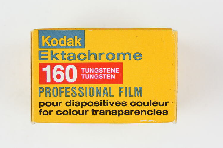 Front, printed: 'Kodak Ektachrome 160 TUNGSTENE / TUNGSTEN / PROFESSIONAL FILM / for colour transparencies' Side, printed: 'Kodak / Ektachrome / 160 / TUNGSTENE / TUNGSTEN / PROFESSIONAL FILM / EPT 135-36'
