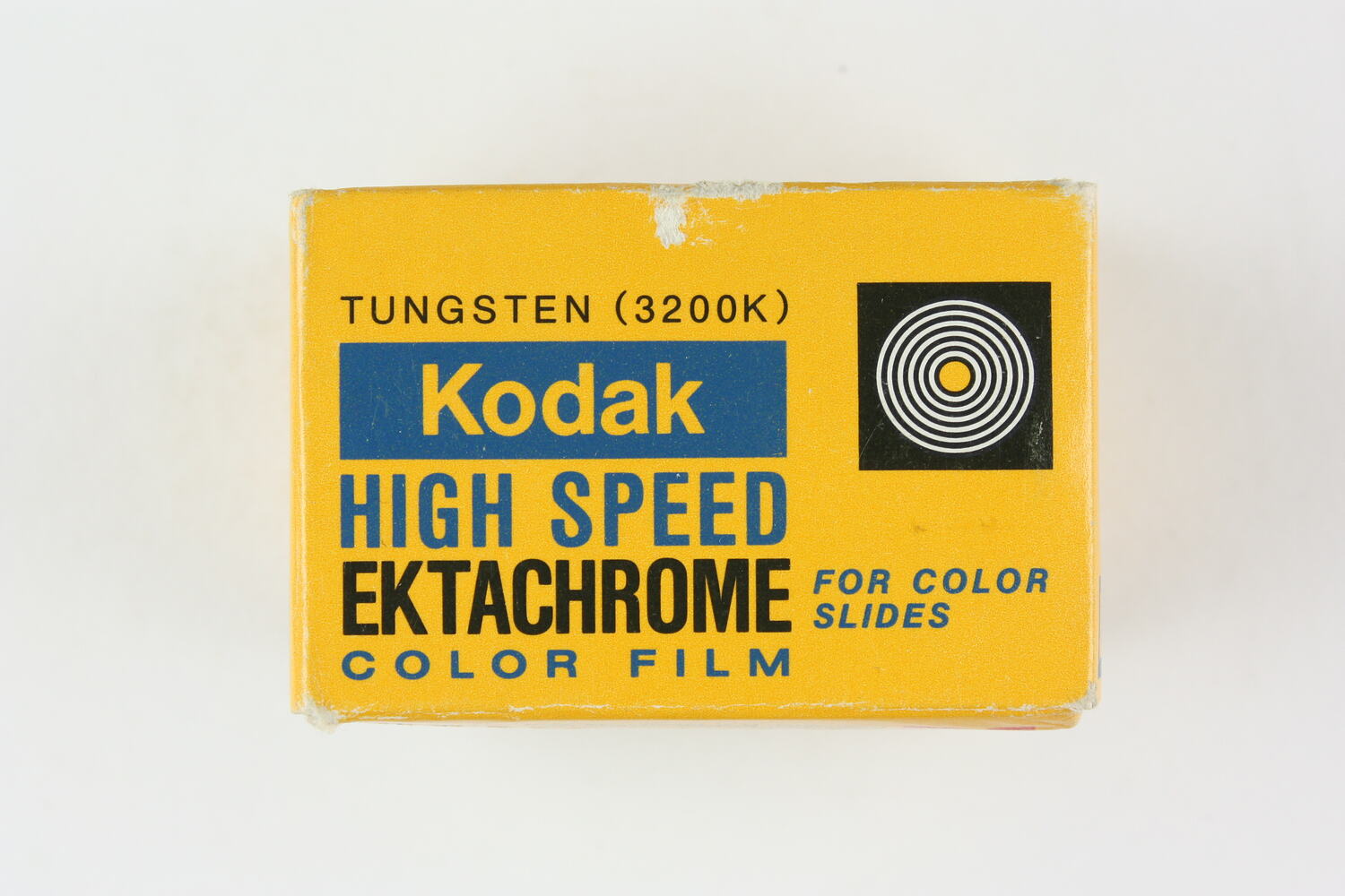 Front, printed: 'TUNGSTEN (3200K) / Kodak [illustration of white and blue circles in a black square with yellow dot in the centre] / HIGH SPEED / EKTACHROME FOR COLOR SLIDES / COLOR FILM'