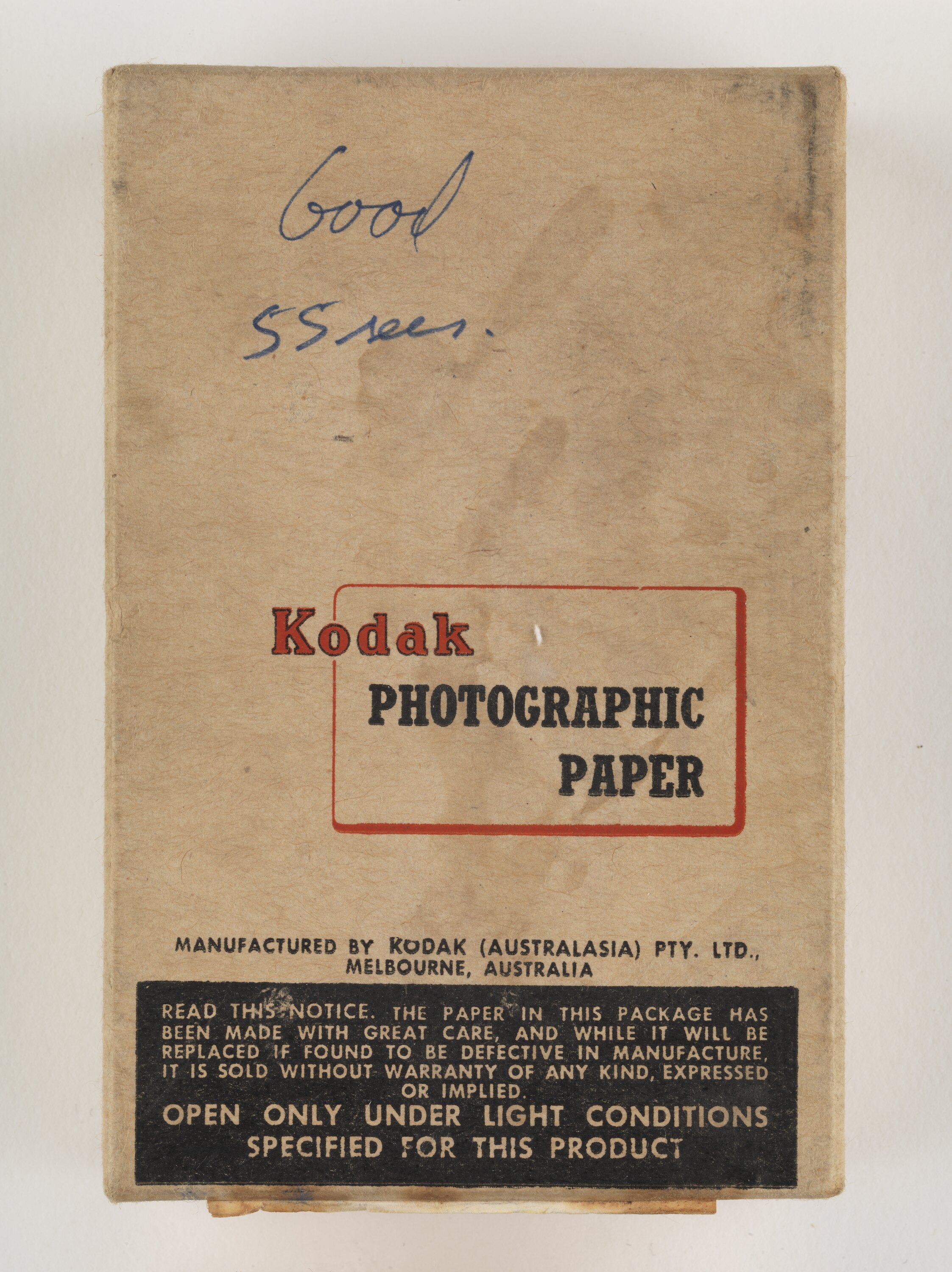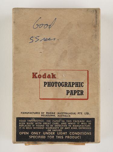 Lid, printed: 'Kodak / PHOTOGRAPHIC / PAPER / MANUFACTURED BY KODAK (AUSTRALASIA) PTY. LTD. / MELBOURNE, AUSTRALIA / READ THIS NOTICE: [...] / OPEN ONLY UNDER LIGHT CONDITIONS SPECIFIED FOR THIS PRODUCT' Lid, handwritten, blue ink: 'Good / 55secs.' Lid, sticker, printed: 'Kodak SINGLE WEIGHT / 100 / SHEETS / VELOX / F.2'