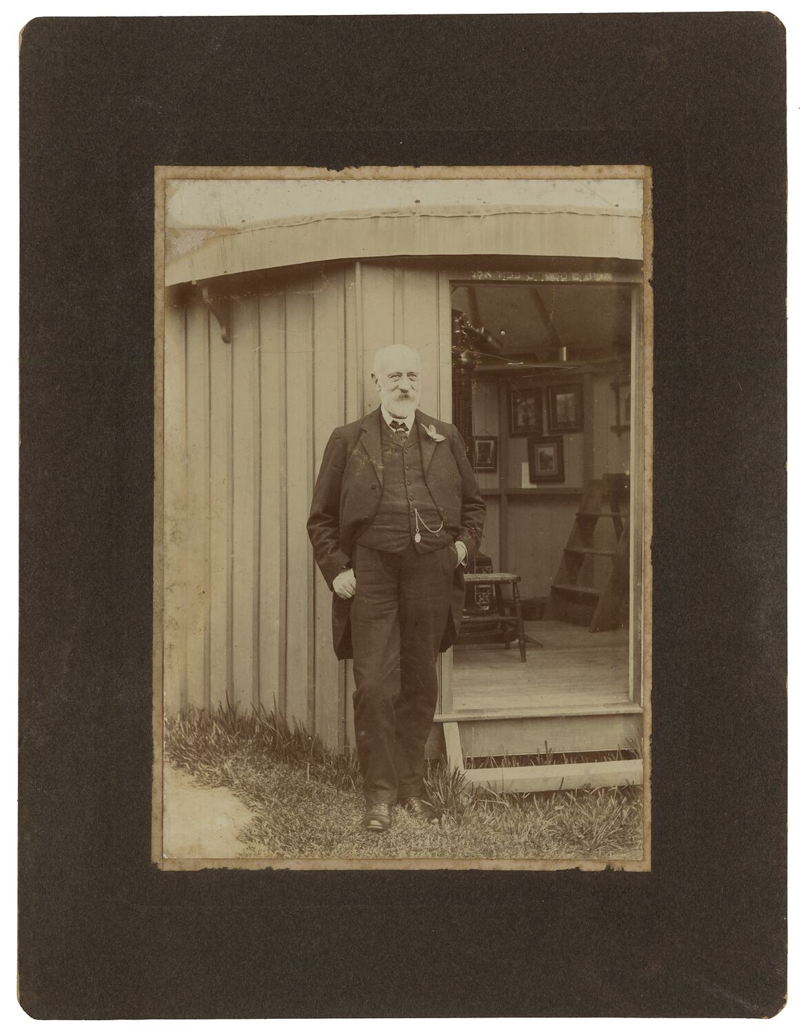 William John Macdonnell (1842-1910), amateur astronomer, sitting in front of his observatory in his home at Mosman, New South Wales, 23 January 1910.