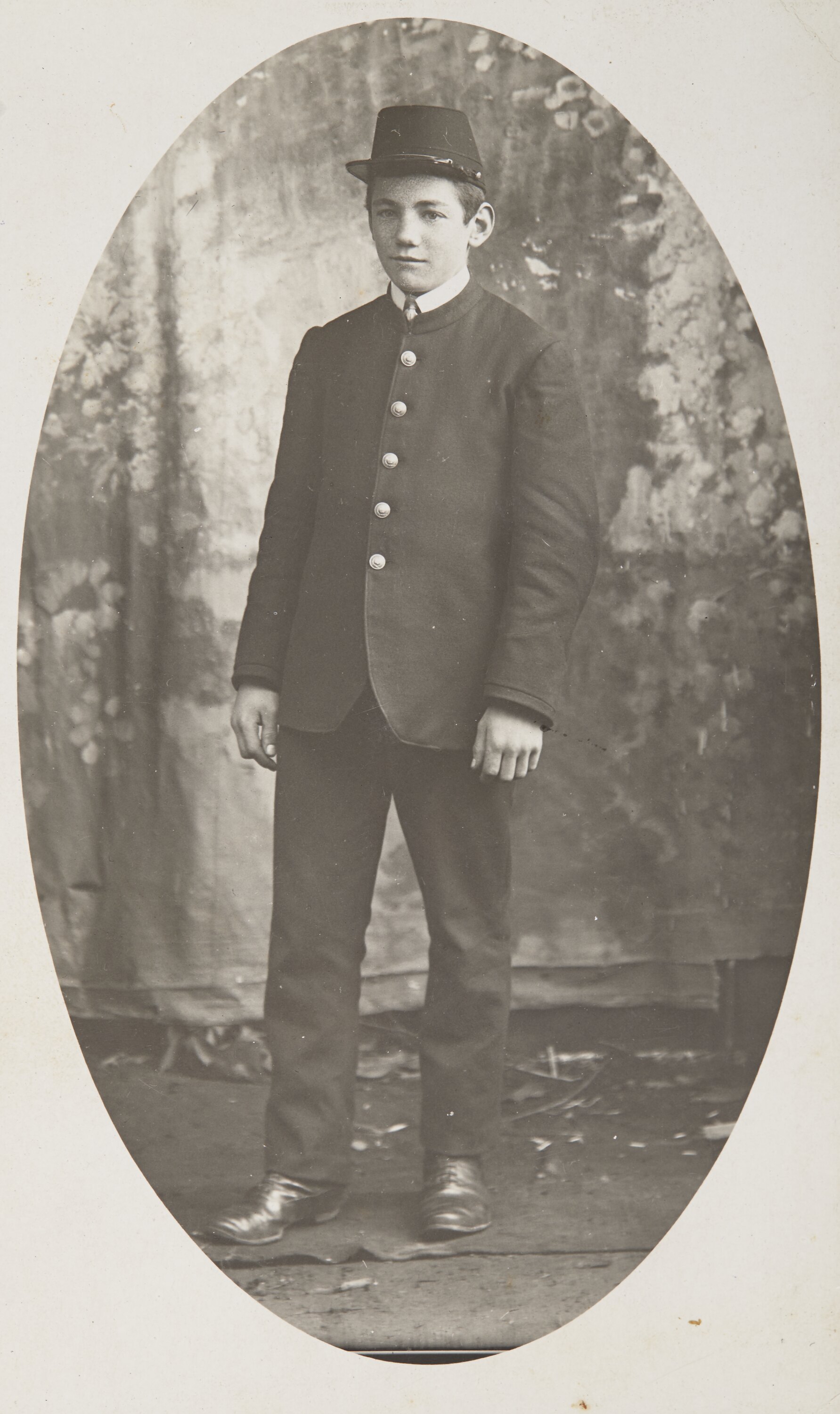 Studio portrait of male youth wearing a uniform and cap.