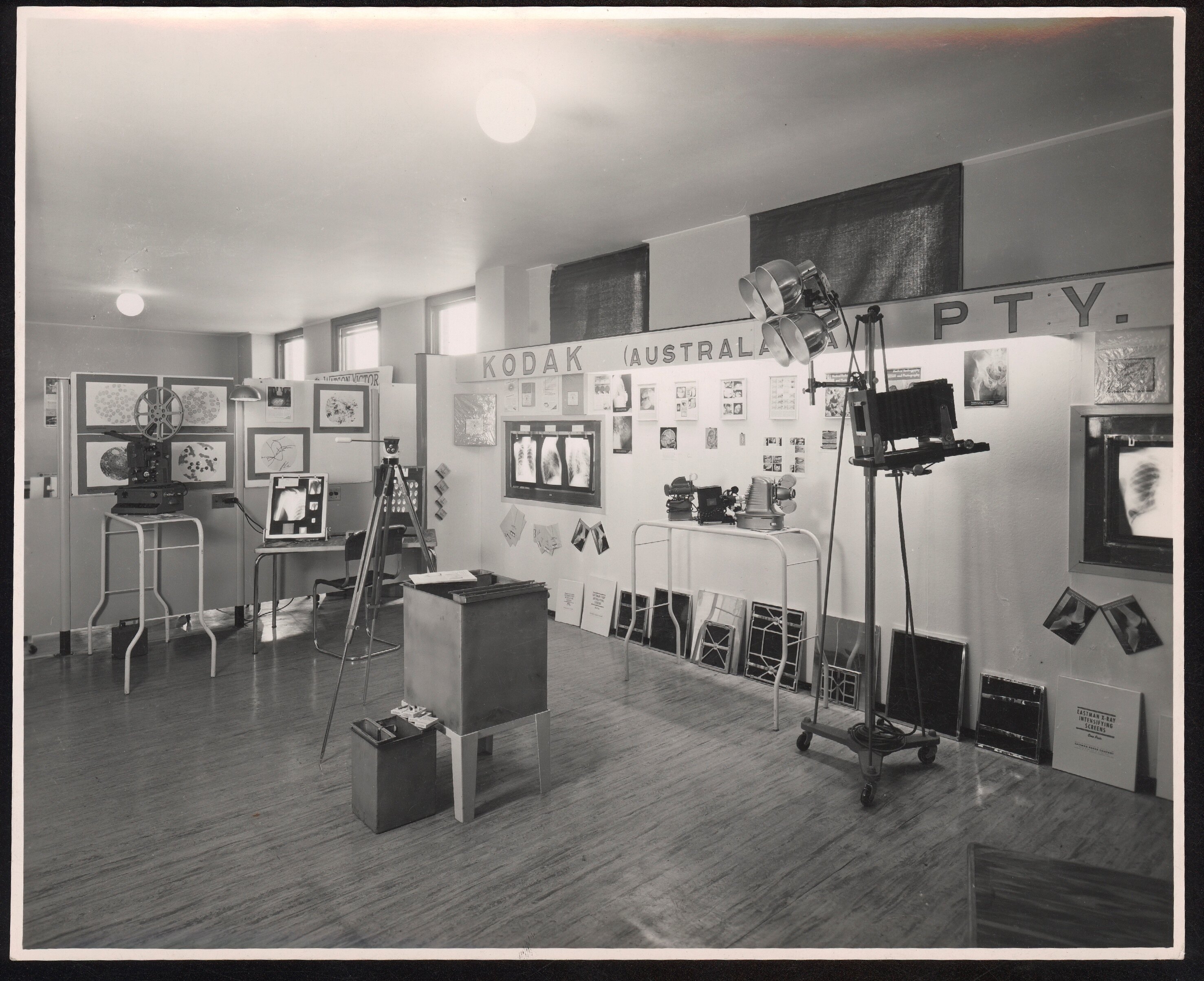 Black and white photograph of a Kodak Australasia Pty Ltd Medical Imaging exhibition stand at a Science Congress held in Melbourne, in March 1948. There are viewing and intensifying screens along the walls, with lights and other medical imaging equipment and film arranged around the space.