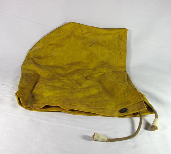 Yellow plastic hood with press studs to secure it to a jacket, and a tie to pull the outer edge close to the face.