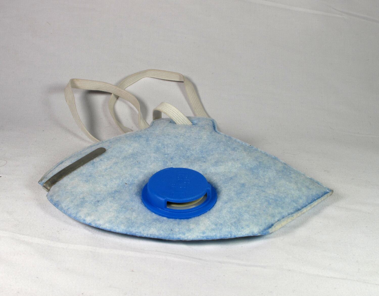 Flat folded face mask, similar to those worn by Peter Auty on Black Saturday. This mask is a Draeger FFP2V Dust Mask which is designed for protection against fine toxic dusts, fumes, water based mists, working with glass, fibre, noonPVC plastic, hardwoods, welding, etc.