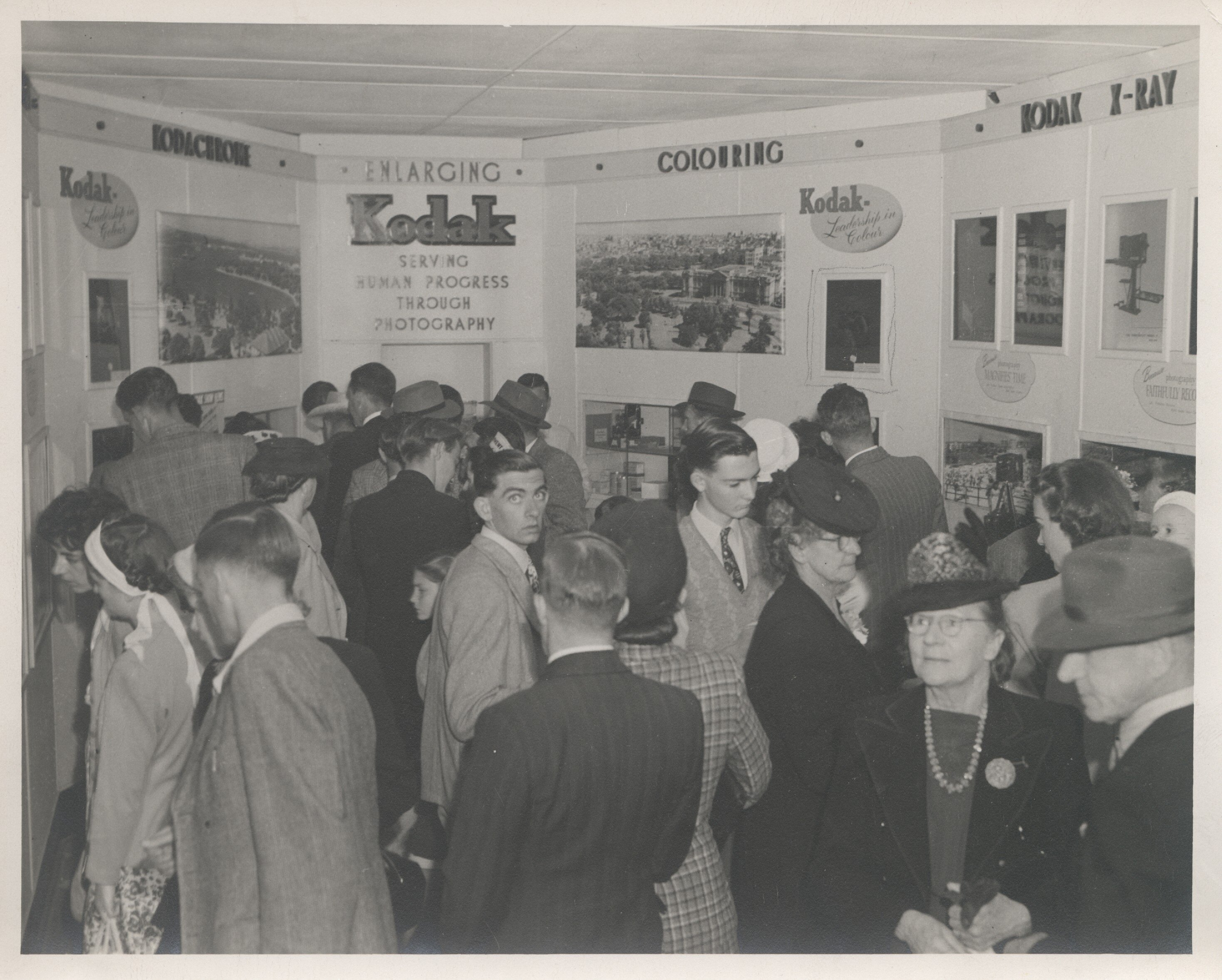Oblique view of men and women looking at Kodak display. Kodak display panels are titled: 'Kodachrome', 'Enlarging', 'Colouring' and 'Kodak X-Ray' with explanatory text and photographs posted beneath.