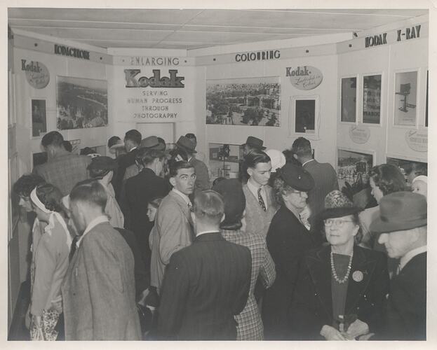 Black and white photograph of a crowd of men and women in the Kodak Australasia Pty Ltd exhibition display stand at the Sydney Royal Agricultural Society (RAS) Easter Show, 1948.