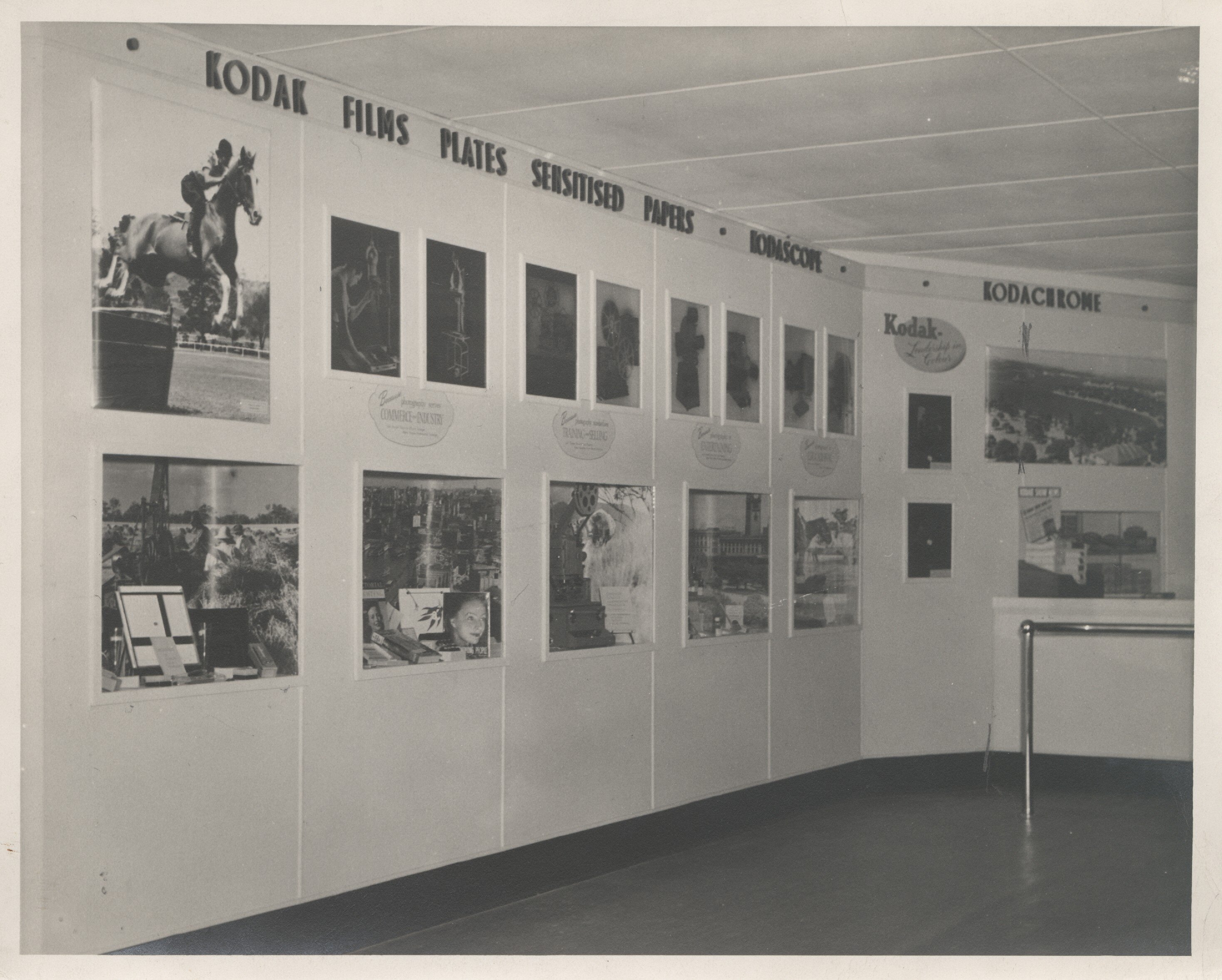 Black and white photograph of one wall of the Kodak Australasia Pty Ltd exhibition display stand at the Sydney Royal Agricultural Society (RAS) Easter Show, 1948. There are five display cases sunk into the walls with photographic backgrounds and products laid out inside. Above these are framed photographs of various Kodak products. The text at the top of the display panels reads: 'Kodak Films Plates Sensitised Papers', 'Kodascope' and 'Kodachrome'. There is a service counter at the back with a metal guard rail.
