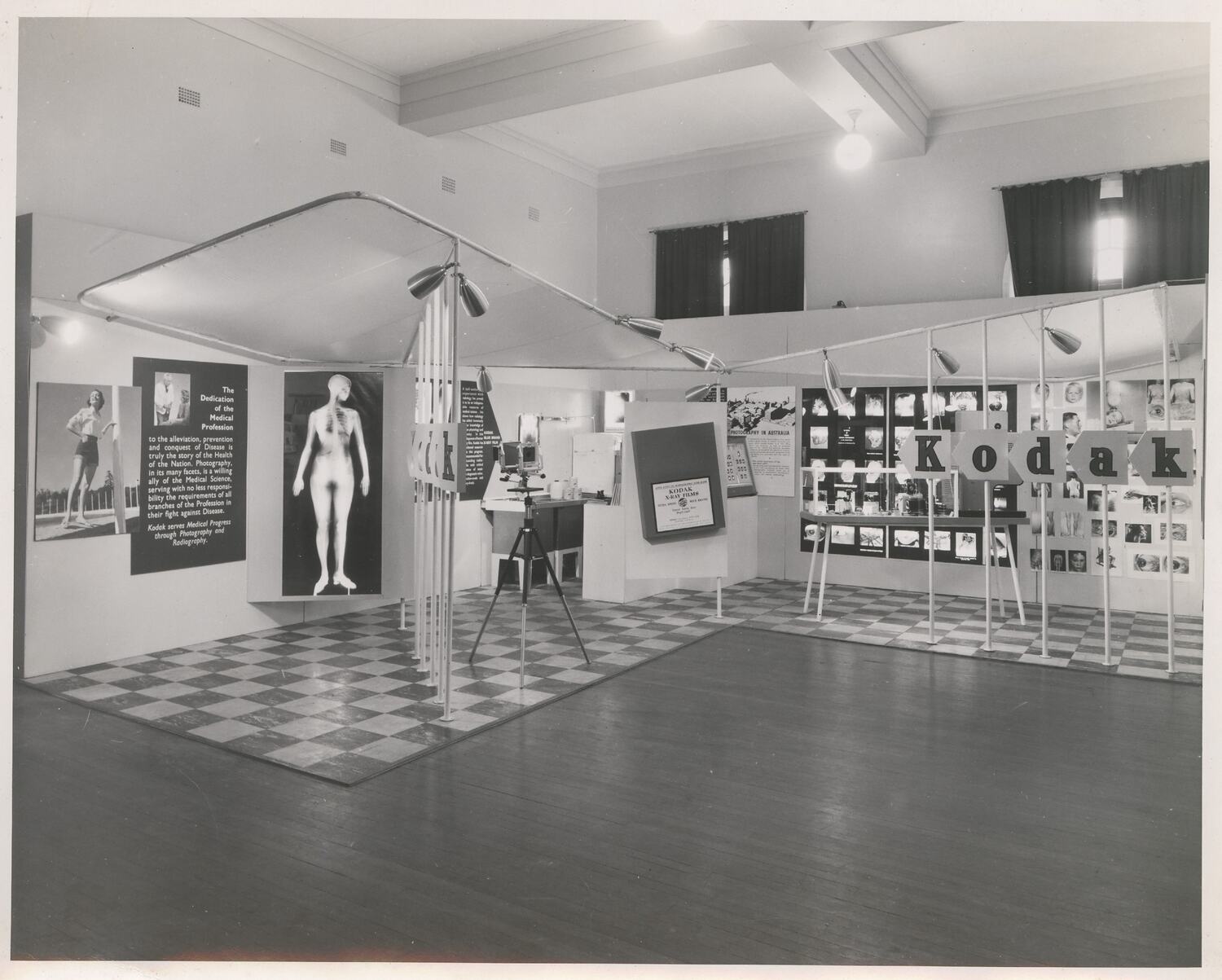 Black and white photograph of a Kodak Australasia Pty Ltd exhibition display stand themed around medical imaging (radiography and x-ray film). The L-shaped display features a chequerboard floor with angled display panels, posters and plinths. There is a large text panel to the far left accompanying a photograph of a woman in shorts and an x-ray image of a woman's body. The text panel is titled, 'The Dedication of the Medical Professional'. There is a large, oversized display box of x-ray film mounted on the wall in the centre of the display.