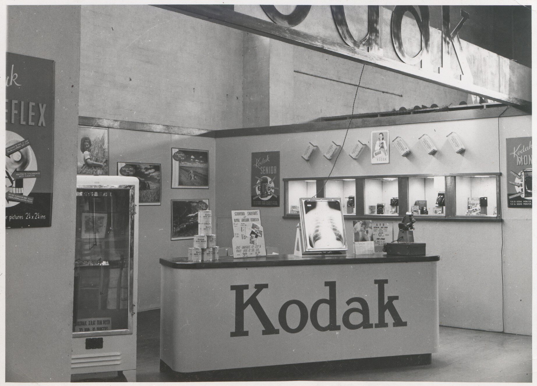 Black and white photograph of a Kodak Australasia Pty Ltd exhibition stand or trade show booth at the Chamber of Manufactures Exhibition held from March to May 1947 in Adelaide. This view shows the service counter, drying cabinet, and wall of recessed display cameras with products and films arranged within. There are posters and x-ray film and photographs mounted around the display.