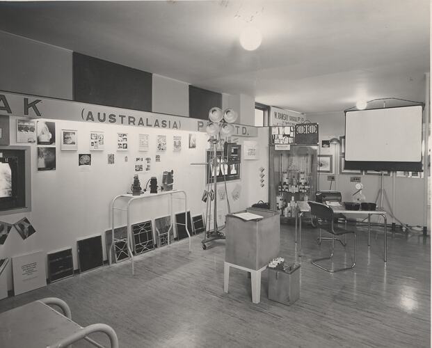 Black and white photograph of a Kodak Australasia Pty Ltd Medical Imaging exhibition stand at a Science Congress held in Melbourne, in March 1948. There are viewing and intensifying screens along the walls, with lights and other medical imaging equipment and film arranged around the space. A large projection screen and service desk are visible on the far right of the image.