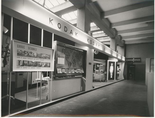 Black and white photograph featuring an angled, side view of a Kodak Australasia Pty Ltd medical and industrial x-ray exhibition stand, circa 1940s. There are various x-ray images backlit in the display, plus equipment and display panels. A display panel in the foreground titled 'Kodak Schools' shows photographs of the School of Medical Radiography and Clinical Photography and School of Industrial and Engineering Photography.