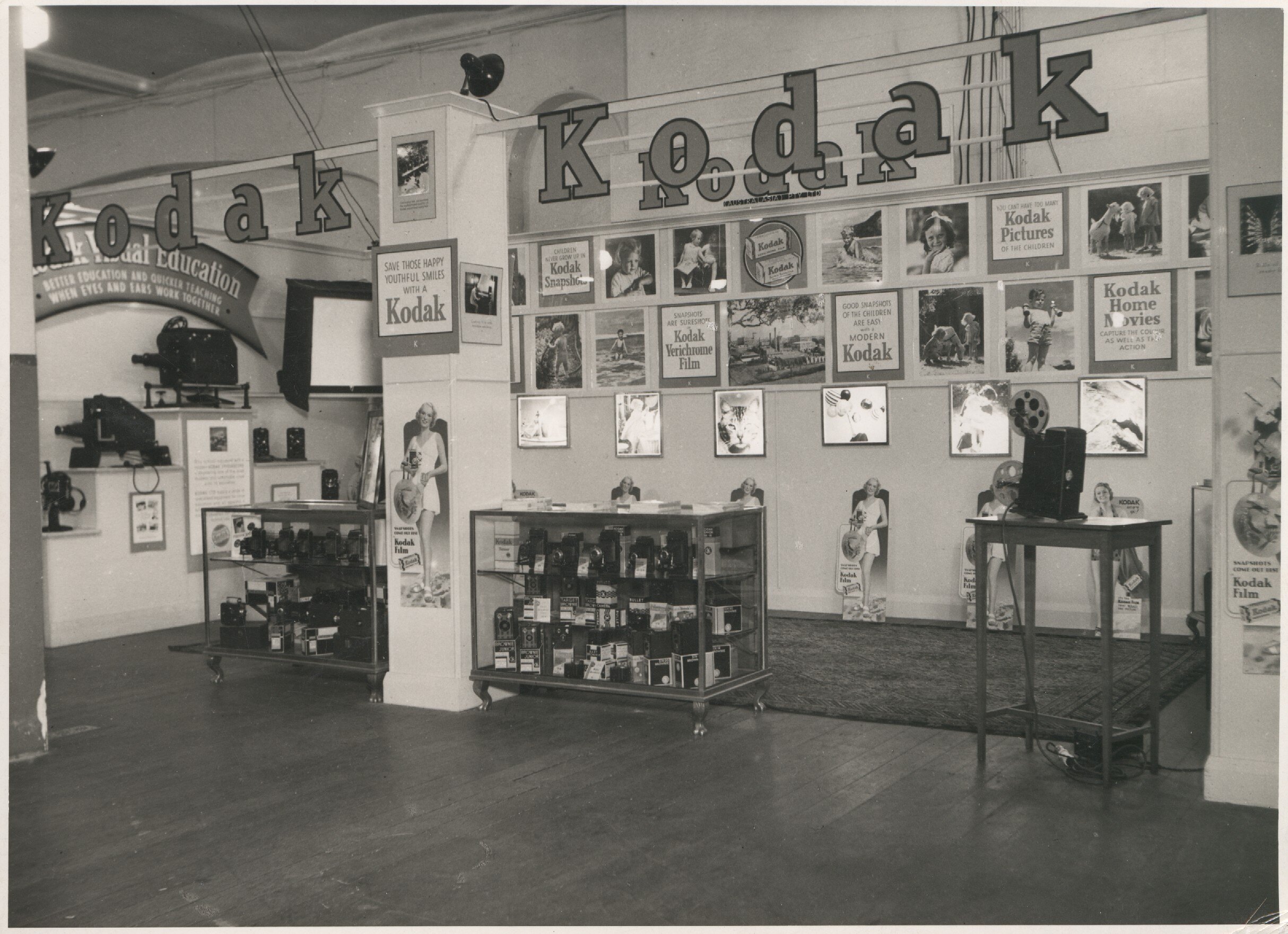 Monochrome photograph of a Kodak Australasia Pty Ltd exhibition stand at a Child Welfare Exhibition, circa 1930s. The display features a number of photographic posters and promotional slogans, along with glass counters full of cameras and accessories. In the background there is a section dedicated to 'Kodak Visual Education' with projectors and a screen arranged in the corner. Promotional slogans used in the display include: 'Good Snapshots of the Children are Easy with a Modern Kodak', 'Save Those Happy Youthful Smiles with a Kodak', 'Snapshots are sureshots with Kodak Verichrome Film', 'You can't have too many Kodak Pictures of the Children', 'Kodak Home Movies capture the Colour as well as the Action', and 'Children Never Grow Up in Kodak Snapshots'.